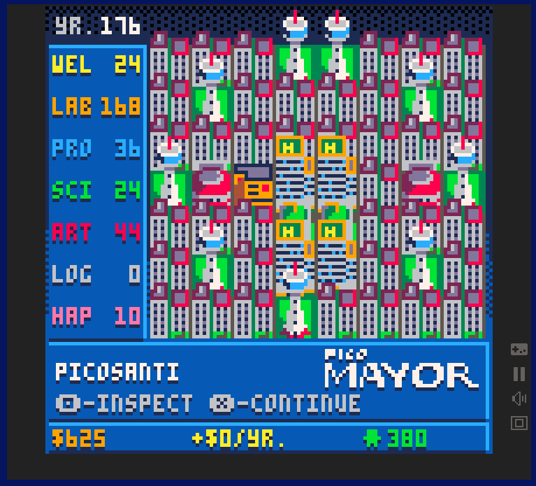 PicoMayor is a city builder game where you have to balance seven Resources (Wealth, Labour, Professionalism, Science, Art and Culture, Logistics, and Happiness) while trying to grow your city. Each building can either consume or produce one or more resources, in addition to either requiring a yearly upkeep or generating a yearly income. Many buildings also interact with each other in ways that may or may not be beneficial, so planning is crucial for your success.